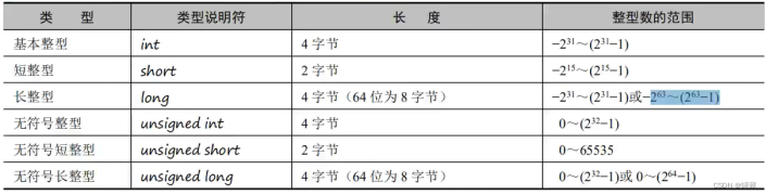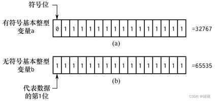 有符号基本整型与无符号基本整型的最高位所代表的意义如下:  不同整型变量表示的整型数范围如下表,超出范围会发生溢出导致计算出错。 只有整型数会产生溢出。  注:32 位的 long 长 4 字节,64 位的 long 长 8 字节。一般为 64 位(服务器)。