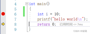 在编译器行号左侧灰色部分点击出现红点(断点)。 当程序运行到断点时(上图出现黄色箭头),执行步骤截止至断点之前。此时 i 的地址内容未发生改变。   点击逐过程,程序运行下一步后,i 地址的内存发生改变,变为 i 的取值 10(十六进制表示为 0a。小端显示:低地址在前,高地址在后,实际存储内容为 00 00 00 0a)。