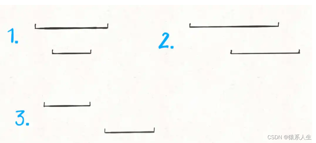排完序之后会出现上述三种情况 1.上面的区间覆盖下面的区间; 2.上下两个区间相交 3.两个区间不相交。
