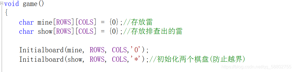 Initialboard(show, ROWS, COLS,'*');//初始化两个棋盘(防止越界)