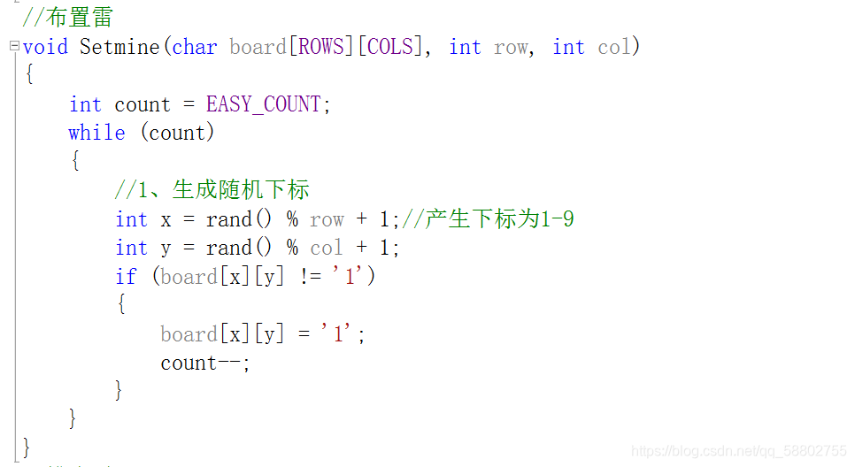 ? ? 一个数x%一个数y,这样取得余数是小于y的值,范围0到y-1。我们已经传参使得row=9,col=9,所以余数范围肯定为0到8,那么再加一就是1到9的范围。(打印棋盘中,增加设置了一横行以及一竖行0-9,便于我们清楚坐标。那么除了打印出来的9x9棋盘,最上方和最右方有0-9。)