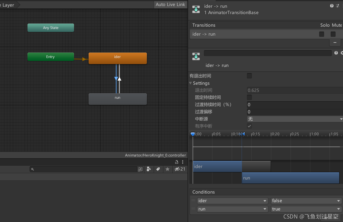 ?在动画器中添加动画(ider),(run)并创建过渡,添加bool类型参数ider和run