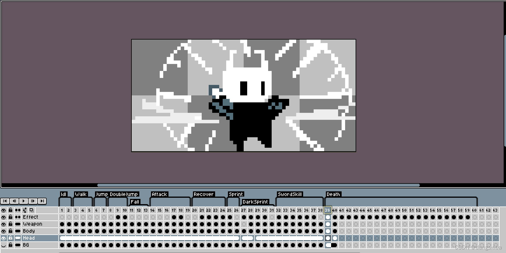 最主要的还是要先把动画做好,第一次做动画没什么经验,画布比较小是64*32,建议做人物画布建立大一点,做好后测试一下能不能运行