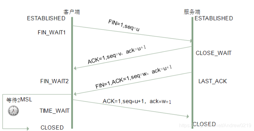 第一次挥手:客户端发送一个 FIN 报文(FIN=1,序号seq=u),并停止再发送数据,主动关闭TCP连接,进入FIN_WAIT1(终止等待1)状态,等待服务端的确认。(我要关闭) 第二次挥手:服务端收到 FIN 之后,会发送 ACK 报文,且把客户端的序列号值 +1 作为 ACK 报文的序列号值,表明已经收到客户端的报文了,此时服务端处于 CLOSE_WAIT 状态。? ? ? ? ? ? ? ? ? ?即服务端收到连接释放报文段后即发出确认报文段(ACK=1,确认号ack=u+1,序号seq=v),服务端进入CLOSE_WAIT(关闭等待)状态,此时的TCP处于半关闭状态,客户端到服务端的连接释放。客户端收到服务端的确认后,进入FIN_WAIT2(终止等待2)状态,等待服务端发出的连接释放报文段。(确认收到) 第三次挥手:如果服务端也想断开连接了,和客户端的第一次挥手一样,发给 FIN 报文,且指定一个序列号。此时服务端处于 LAST_ACK 的状态。 即服务端没有要向客户端发出的数据,服务端发出连接释放报文段(FIN=1,ACK=1,序号seq=w,确认号ack=u+1),服务端进入LAST_ACK(最后确认)状态,等待客户端的确认。(服务器确认,等客户端确认) 第四次挥手:客户端收到 FIN 之后,一样发送一个 ACK 报文作为应答,且把服务端的序列号值 +1 作为自己 ACK 报文的序列号值,此时客户端处于 TIME_WAIT 状态。需要过一阵子以确保服务端收到自己的 ACK 报文之后才会进入 CLOSED 状态,服务端收到 ACK 报文之后,就处于关闭连接了,处于 CLOSED 状态。 即客户端收到服务端的连接释放报文段后,对此发出确认报文段(ACK=1,seq=u+1,ack=w+1),客户端进入TIME_WAIT(时间等待)状态。此时TCP未释放掉,需要经过时间等待计时器设置的时间2MSL后,客户端才进入CLOSED状态。
