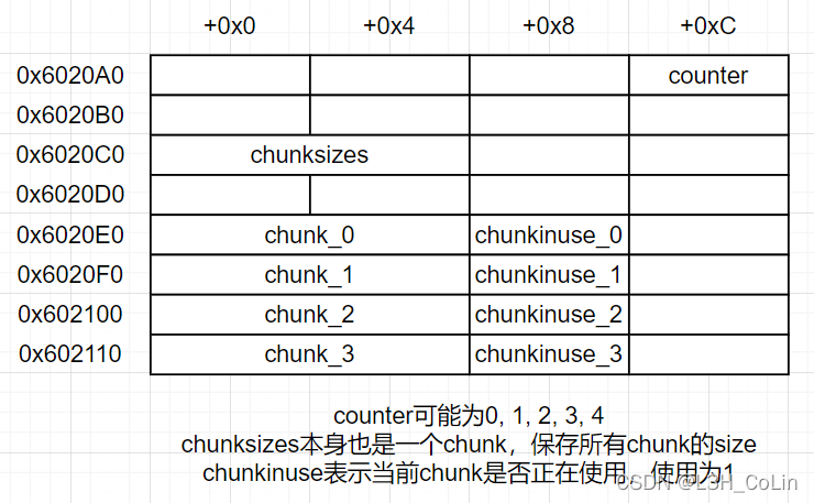 经过gdb调试发现,bss段中对于chunk相关信息的存储结构如下: