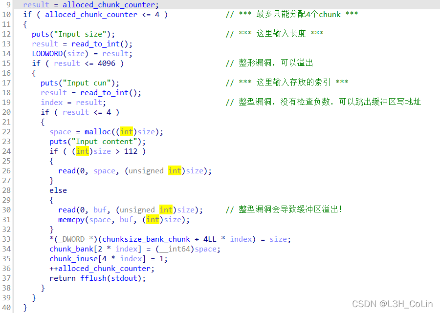 - 在create_exploit函数中的两个整型溢出漏洞,使chunk地址可以写到缓冲区的高地址处