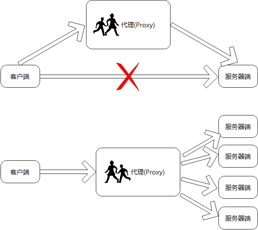 ? ? ? ? 反向代理是这张图下面的情况,不同的我们只知道代理服务器的地址,并不知道在其后面隐藏的服务,因此反向代理代理的是目标服务器,我们只知道一个地址,通过这个地址就可以访问代理服务器,代理服务器再访问它代理的目标服务器为我们服务。