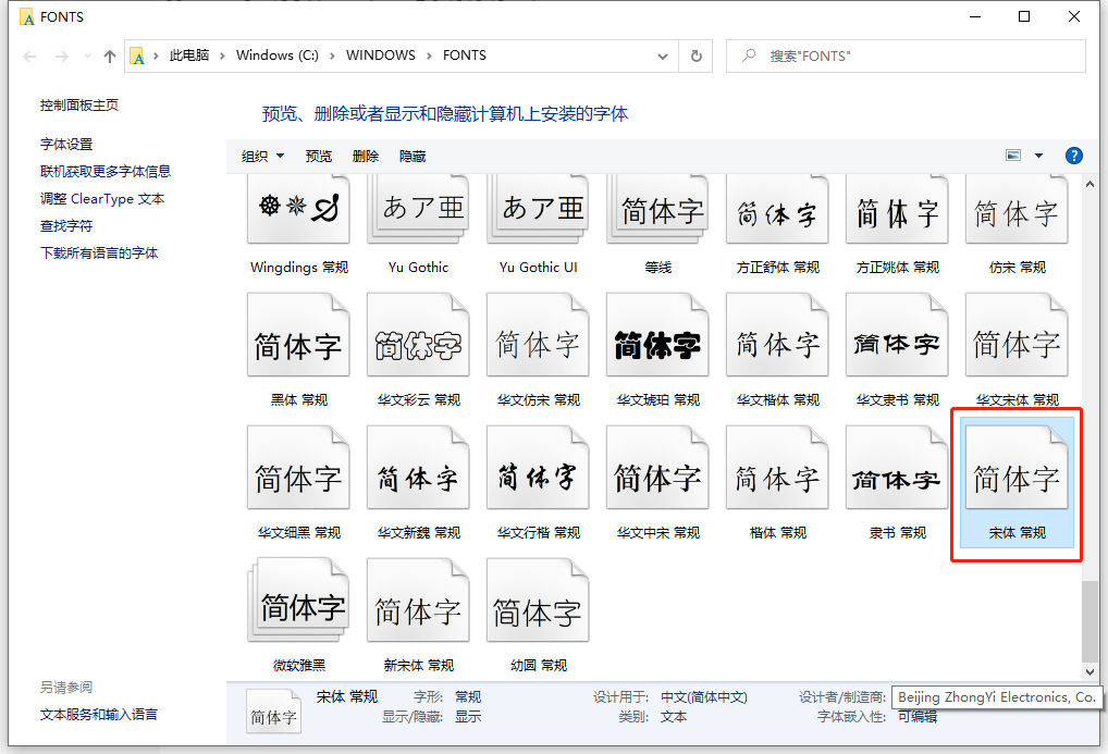 win10系统中,字体文件位置:C:\WINDOWS\FONTS。  将宋体字体文件拷贝出来(比如,放到桌面),改字体文件名为:simsun.ttc。