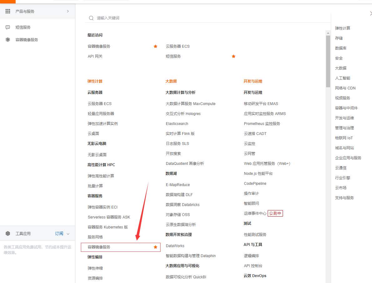 登录阿里云,进入控制台,搜索镜像容器服务  -