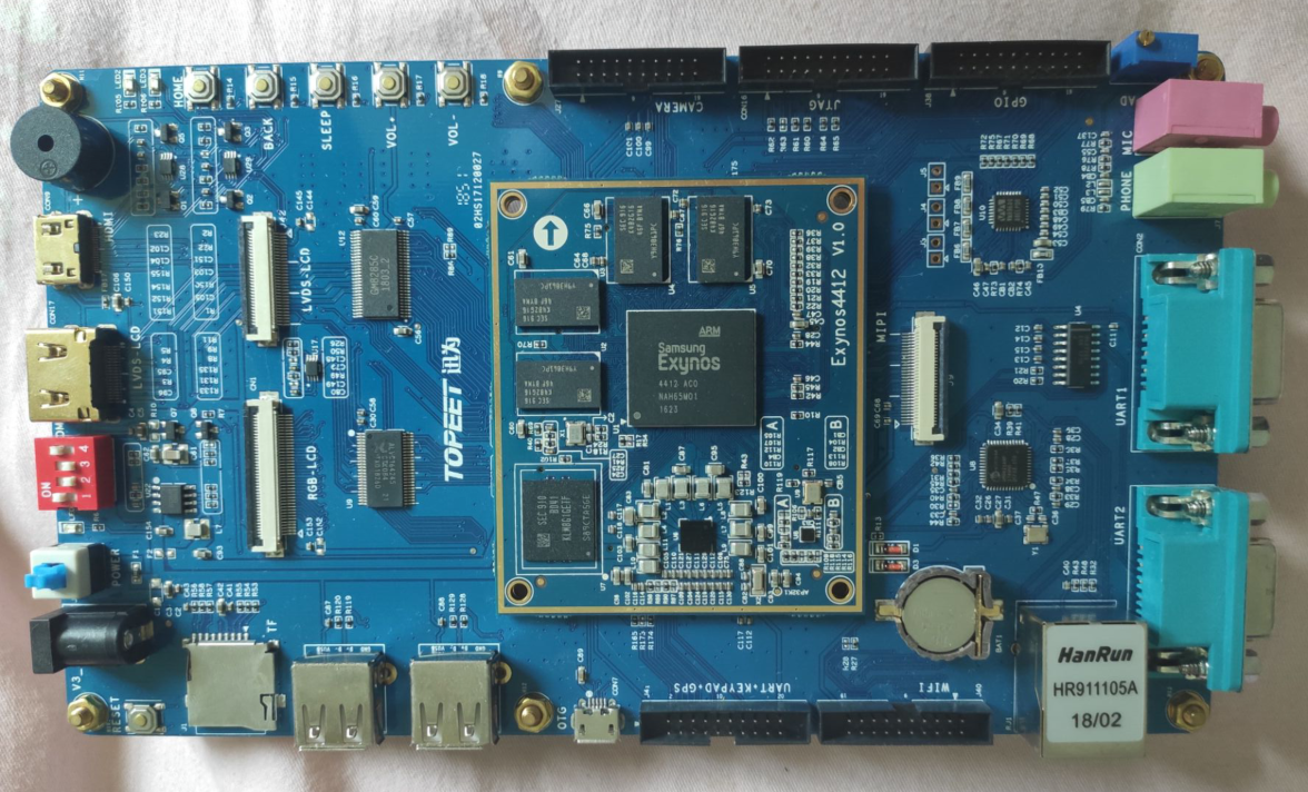 exynos4412芯片带有一个USB_OTG接口,和两个HSIC接口。开发板上的USB_OTG接的就是那个小的micro USB OTG接口(CON7)。而两个HSIC只用了HSIC1,连接了USB3503A芯片(核心板右下角最小的那个正方形黑芯片,标号为U8),通过这个芯片扩展了三个USB口出来,其中两个就是那两个大的USB口,另一个接的就是板上的DM9621A芯片。 简单来说,就是exynos4412的HSIC1接了USB3503A芯片,这个芯片扩展出了3个USB端口。第一个口接的是中间那个大USB口(CON15),第二个口接的是DM9621A芯片,第三个口接的是左边那个大USB口(CON14)。 我们前面已经在两个大USB口上插过U盘了,U盘能正常识别和读写,mdev自动挂载/卸载U盘也没问题,这说明,USB3503A芯片是正常工作的,我们只需要在内核里面选中网口驱动,就能联网了。