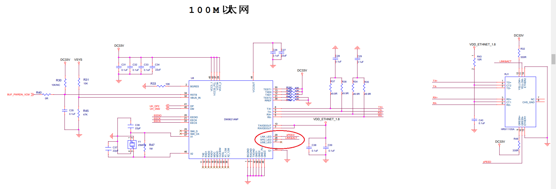 习惯上,绿灯的亮灭表示连接状态,黄灯闪烁表示在收发数据。笔记本和台式电脑的网口基本都是这样设计的。那为什么迅为板子上是绿灯闪烁,黄灯不闪呢?因为迅为画板子的时候,把LNK和SPD灯接反了。如下图红框中所示,29脚LNK_LED本来该接LNK&ACT(黄灯)的,28脚SPD_LED本来该接sPEED(绿灯)的,但是红框中却接反了!大家画板子抄电路的时候一定要注意这个问题。