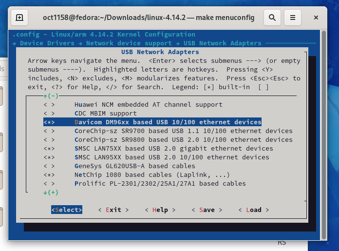 我们打开内核配置菜单(make menuconfig),进入到Device Drivers ---> Network device support ---> USB Network Adapters,选中Davicom DM96xx based USB 10/100 ethernet devices选项: