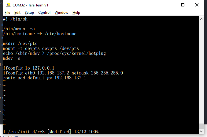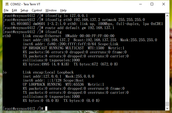 我们执行下面三条命令,手动配置一下IP地址: ifconfig lo 127.0.0.1 ifconfig eth0 192.168.137.2 netmask 255.255.255.0 route add default gw 192.168.137.1