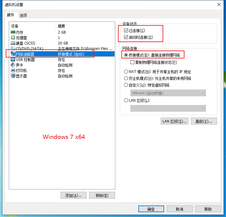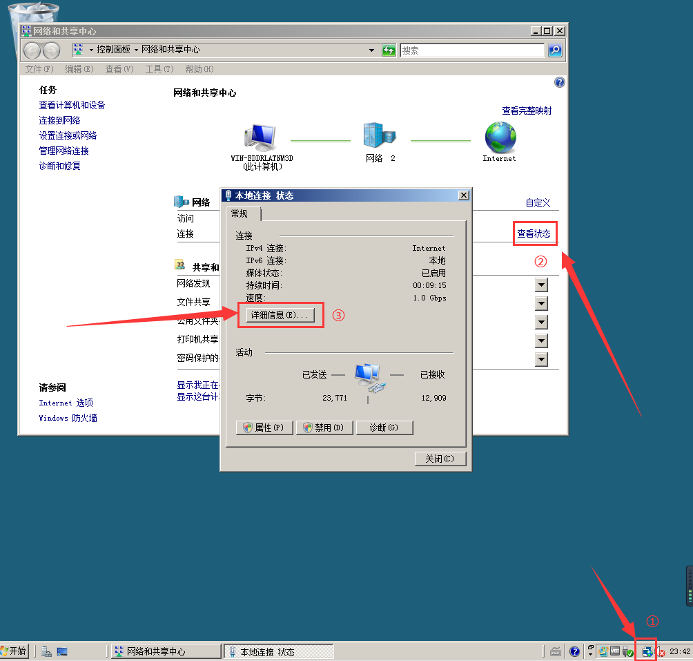 4.2 客户端上验证首先,打开Windows 7虚拟机。<注意:服务器必须保证开机,不能关机>。 (1)准备工作打开Windows 7 x64虚拟机,并且设置网络适配器下,设备状态选择已连接、启动时连接;网络连接方式选择:桥接模式。如下图: (2)客户端的设置设置 IP 地址 设置IP的步骤:打开进入Windows 7 x64虚拟机—打开网络和共享中心----点击“本地连接”----点击“属性”----选择“Internet协议版本4(TCP/IPv4)” 步骤一:打开网络和共享中心,如下图: